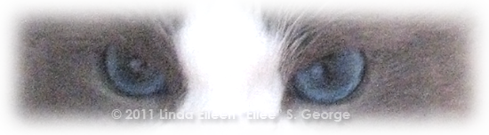 Welcome to Yeti’s world! Yeti is a bi-color blue-point Ragdoll, a sweet, blue-eyed, fluffy white and gray cat that is similar to the Himalayan breed. She is very mellow and gentle most of the time, but she gets playful and adventurous when she feels like it. She shares a house with her criminal-genius frenemy Peekaboo and their pets, er, people, whom they apparently refer to as The Missus and The Mister, or sometimes, MamaCat and PapaCat (even though they’re people). No self-respecting cat thinks of its caretakers as its “owners” – a person can never truly own a cat!