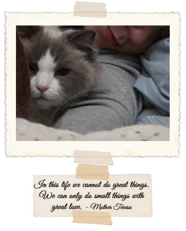 My in-laws have been simply amazing in so many ways. My church family and friends have been so supportive and rallied around me. A special neighbor has been a comrade and an encouragement as a survivor herself. Other patients that I met in the process have been inspirations to me as well, mid-battle, and I hope I was able to serve as such in return. All of the medical personnel that I have dealt with have been not only professional but also consistently compassionate; they have found their calling. And of course my fluffy little Peekaboo and Yeti the cats have been a peaceful presence as well as providing entertaining interludes, serving to remind me further just how much joy there is to be found in the simplest moments in life. There was no irony in my singing, “It’s a Good Day” in the dressing room for the MRI…I really believed it. Every day I’m alive is a good day!
